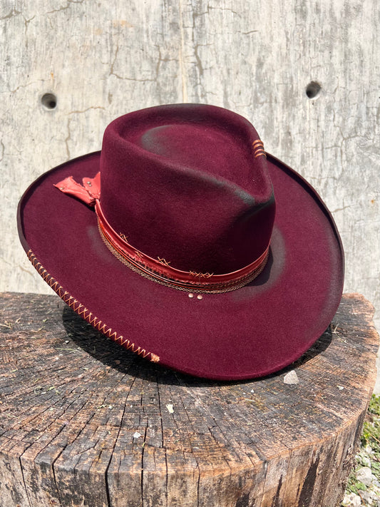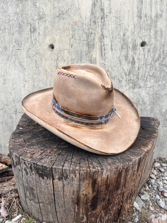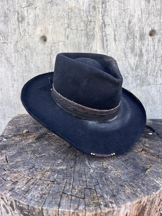 Custom tear drop, pinch style crown with medium distress. This hat has a 3" brim with a pencil rolled edge. It has a distressed style, overlapping, hat band with feather band detail.